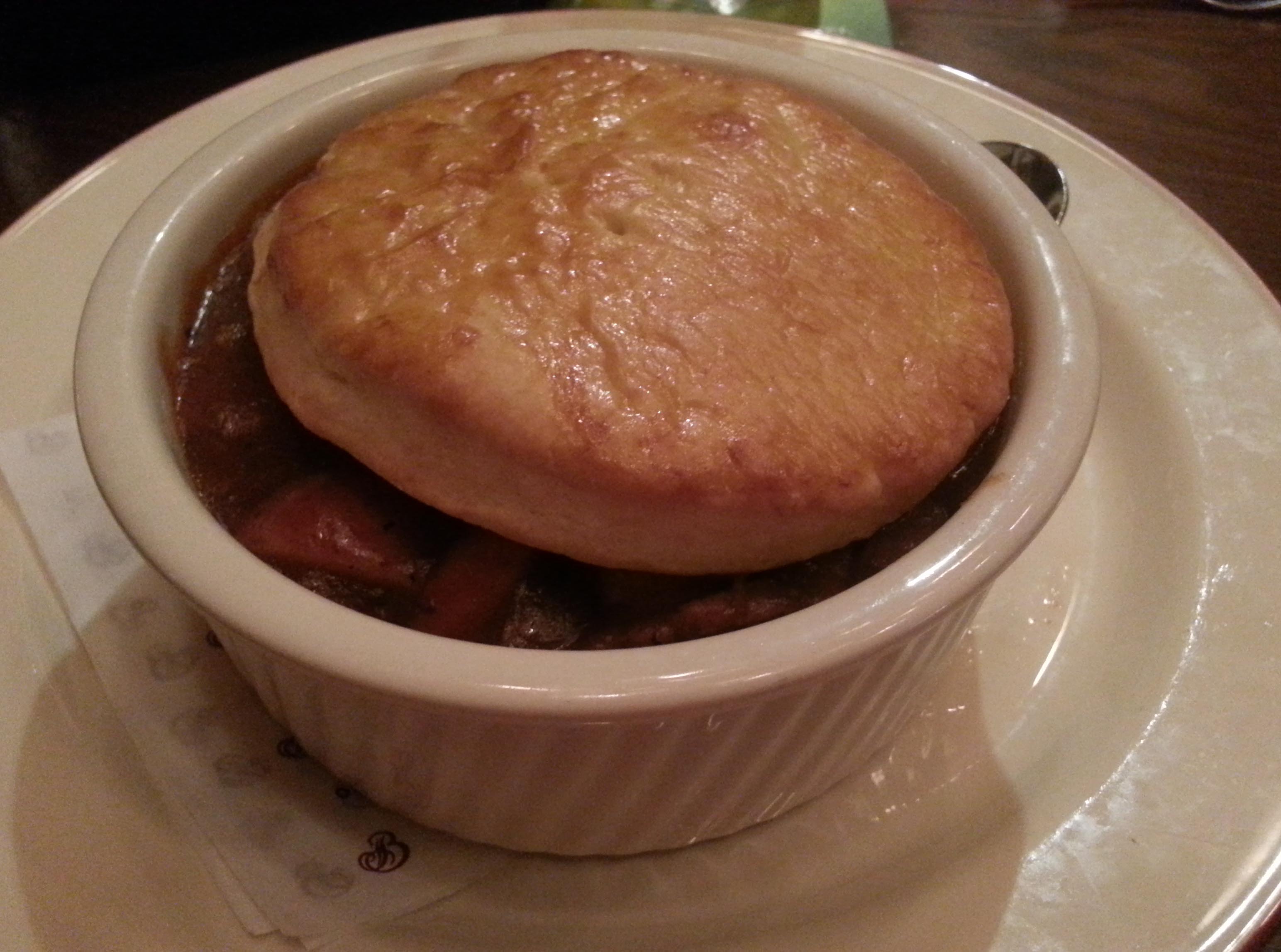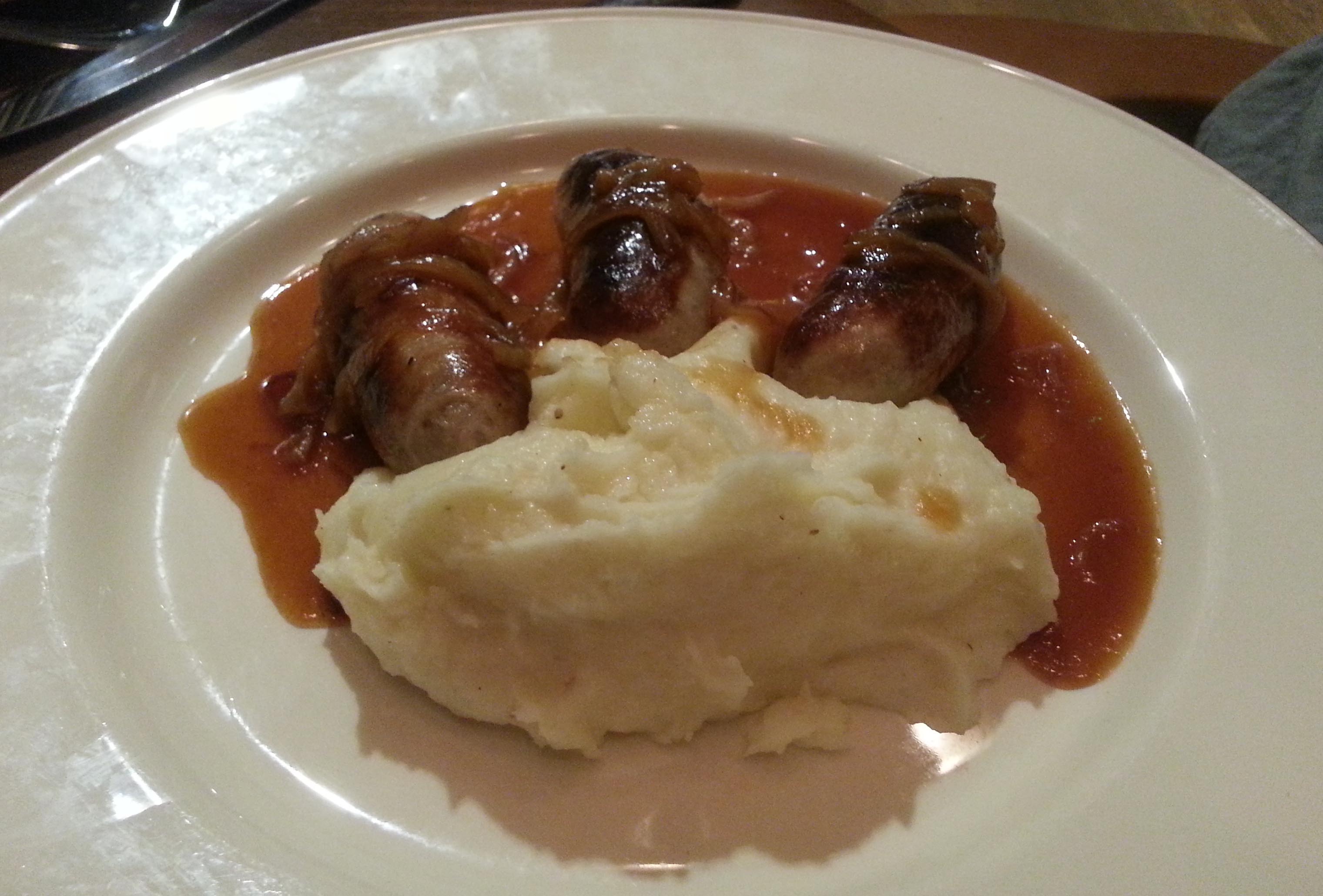 In keeping with the pub theme, my husband ordered the Fish and Chips and was disappointed. Two of us ordered the Cottage Pie, beef tips with vegetables in a rich gravy beneath a golden biscuit-like crust. The vegies were inconsistently cooked and the crust was dense. The same was true of the Chicken Pot Pie. The winning dish of the night was the Bangers and Mash. A sherry sauce with onions served over the sausages created entrée-envy among us.