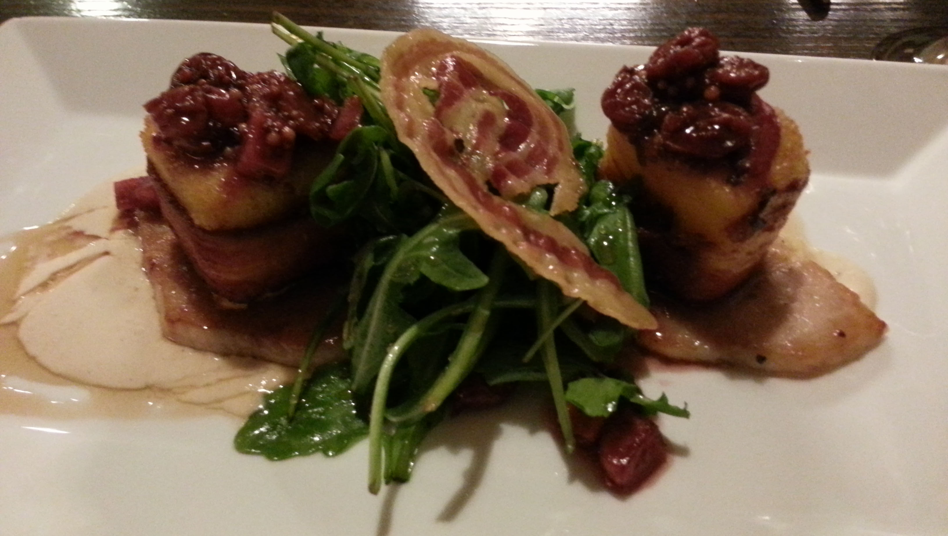 Zink Kitchen+Bar is a well-kept secret. After all, who’d think to look in a Doubletree Hotel for an eclectic restaurant with a bold menu, good service and quality food? Half a dozen small plates are offered, any combination of which would make a complete meal. Our group opted for All Things Bacon as a starter. It was more than bacon, but somehow All Things Pork or even All Things Porcine doesn’t have the same ring. This indulgent plate successfully combined pork belly, maple bacon, pancetta and polenta in a mustard and dried fruit sauce.