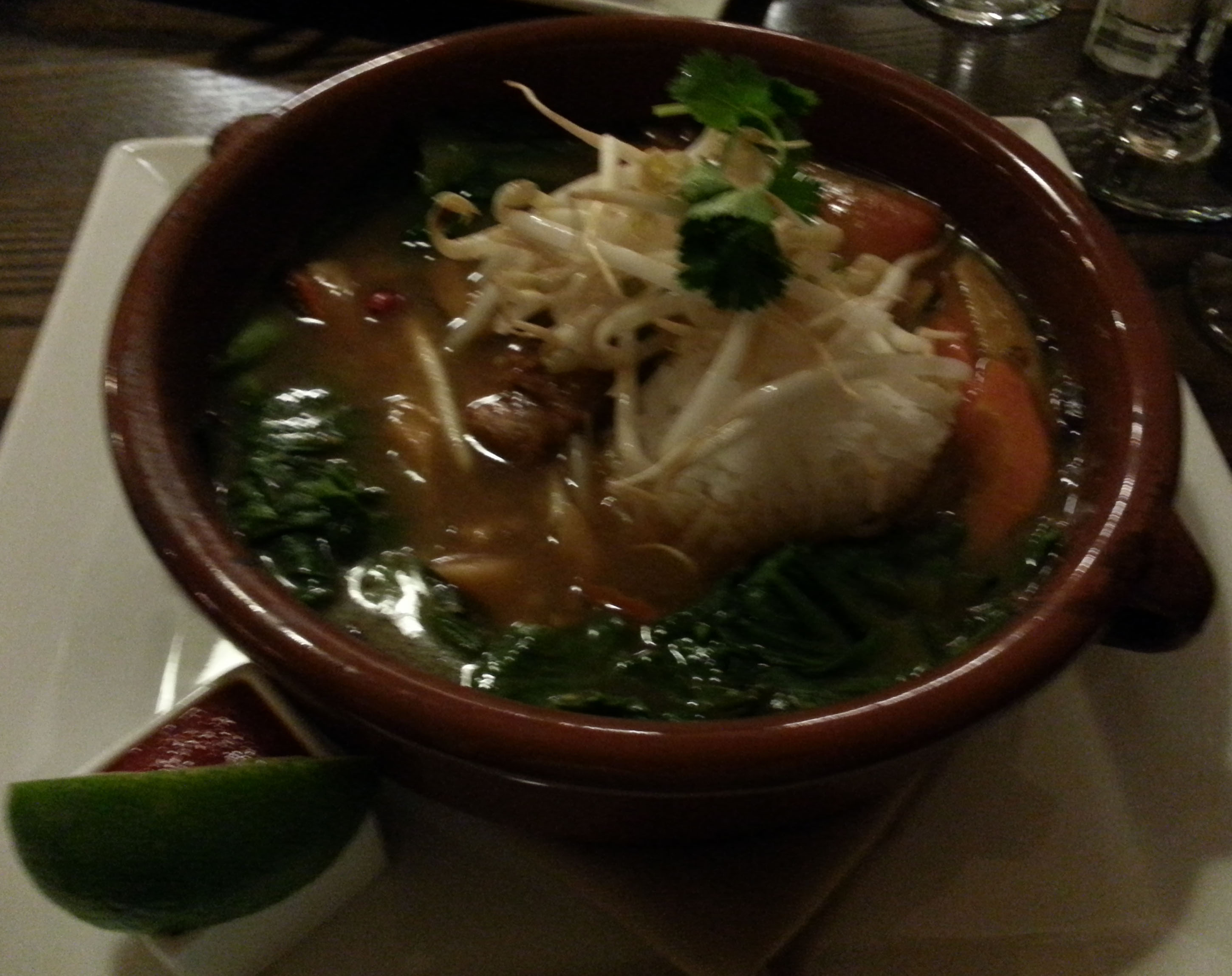 The Mac ‘n Cheese was thick, rich and creamy. The tangy barbecue-sauced ribs provided much needed balance. The enchiladas featured a white sauce augmented with Hatch green chile. It had a trace of a kick which allowed the chicken filling to take center stage. The sweet corn relish was a nice addition, but the side salad was superfluous. My Vietnamese Chicken wasn’t really in a clay pot. Still, it was quite good: an Asian version of chicken soup thick with Shitake mushrooms, bok choy, crispy pieces of chicken and Jasmine rice.