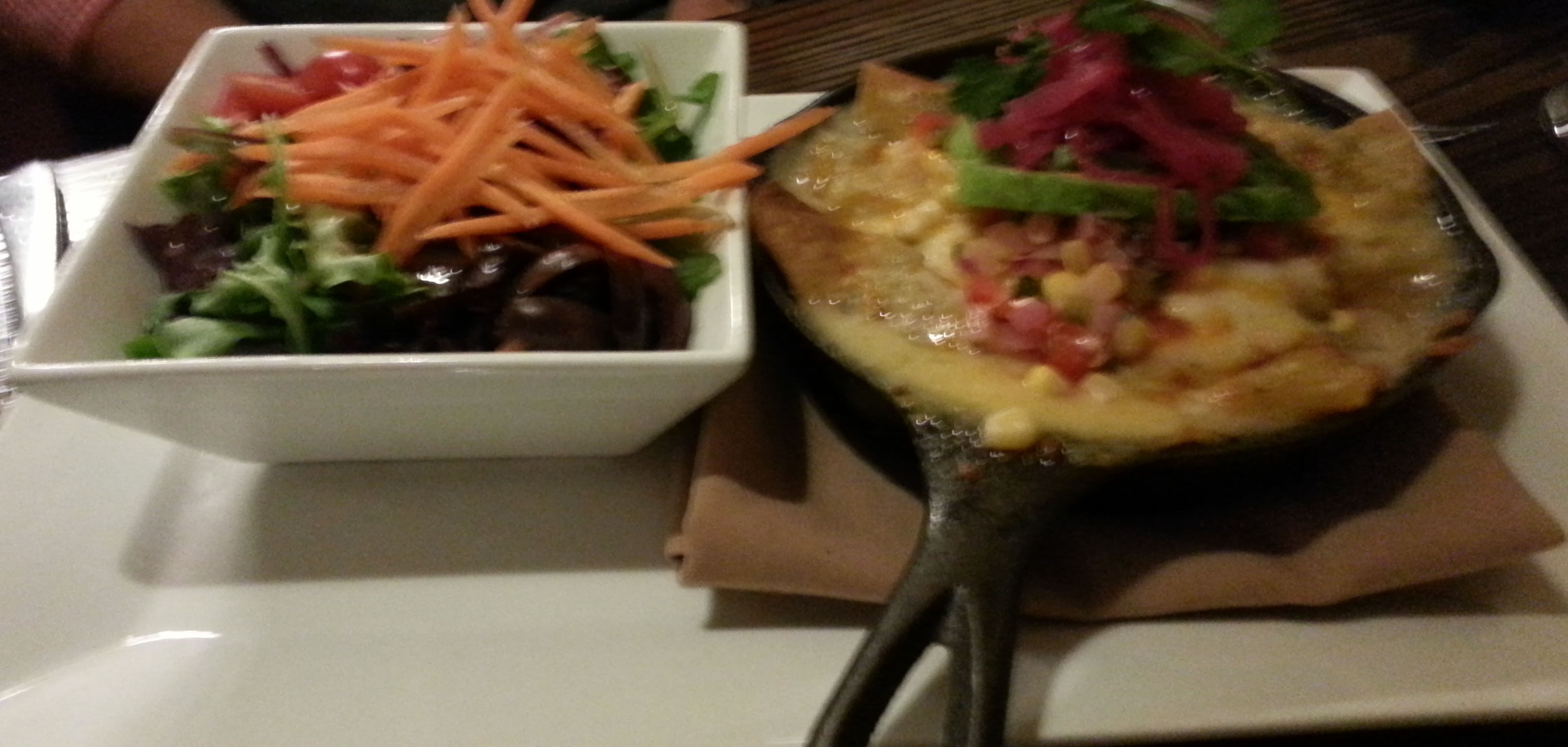 Our server recommended the entrée items from the Wood Stone Oven: BBQ Pork Mac ‘n Cheese, Smoked Chicken Enchiladas, Vietnamese Chicken Clay Pot and Artisan Flatbread Pizza topped with sausage and red pepper. It was a culinary version of the U.N.