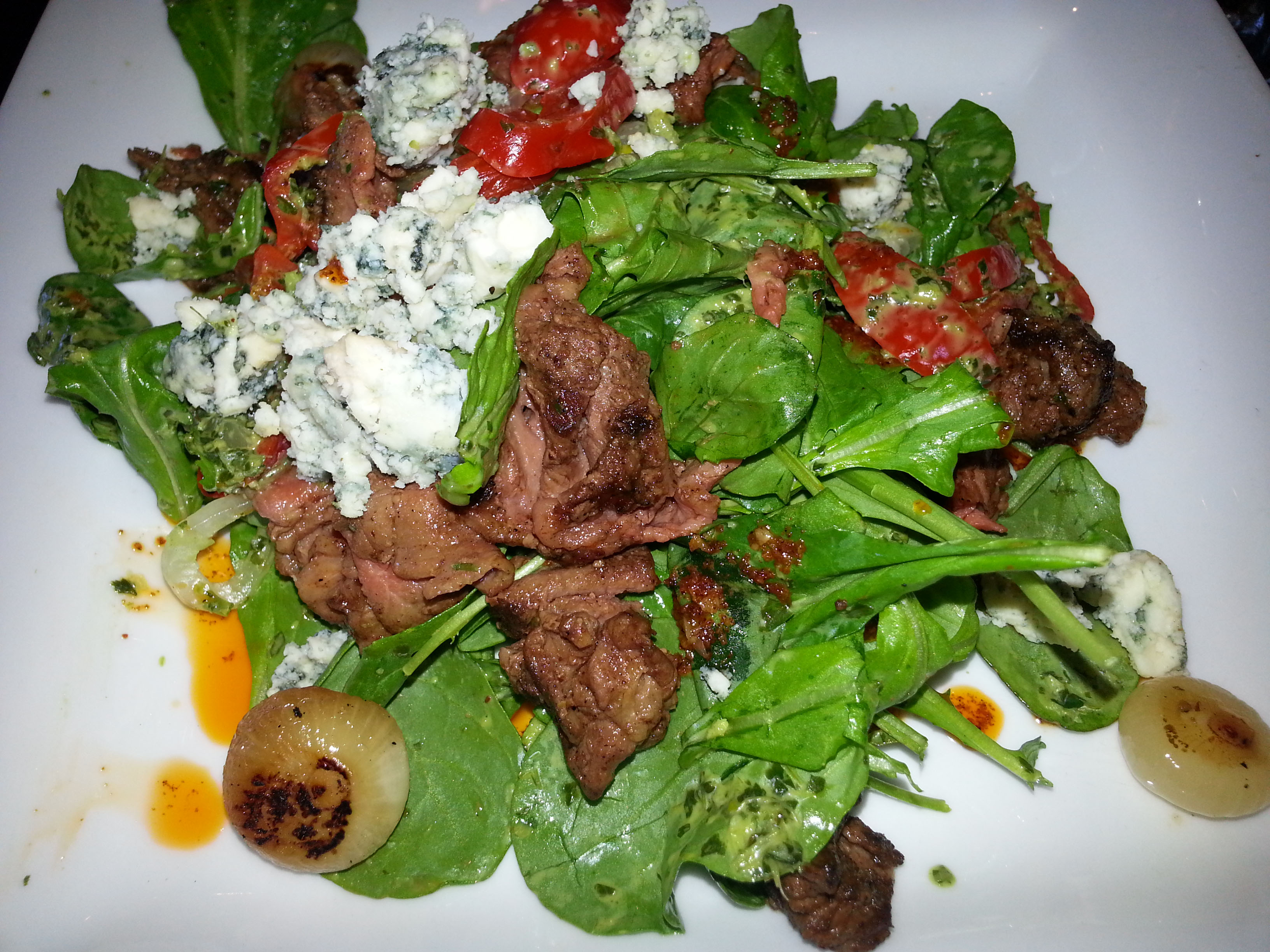 Steak Salad usually doesn’t catch my attention, but when the ingredients include harissa, bleu cheese and chimichurri, it’s hard to resist. I’m glad I didn’t. The tender pieces of flank steak and harissa, a Middle Eastern condiment of chile, garlic, cumin and other spices, would have been satisfying on their own. The inclusion of bleu cheese, roasted red peppers, cipollini onions and peppery arugula dressed with chimichurri in vinaigratte form resulted in an exquisite combination of flavors typically not associated with one another.