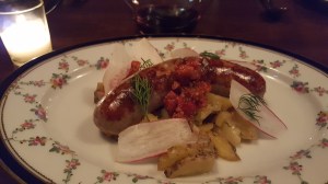 I was especially impressed with the elements of creativity. Among the appetizers is a house-made pretzel served with a savory and sweet cherry mustard. That’s  right, cherry mustard. Scallops are paired with chorizo for a lively blend of flavors. A house made bratwurst features strawberry relish. A soup made with ringlets of caraway crepe adds lamb bacon (made in-house). The list goes on.