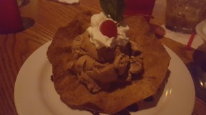 As if we didn’t have enough to appeal to our palates, we had a choice of flan or ice cream for dessert. The chocolate ice cream was overshadowed by the fried, cinnamon-coated tortilla accompanying it.