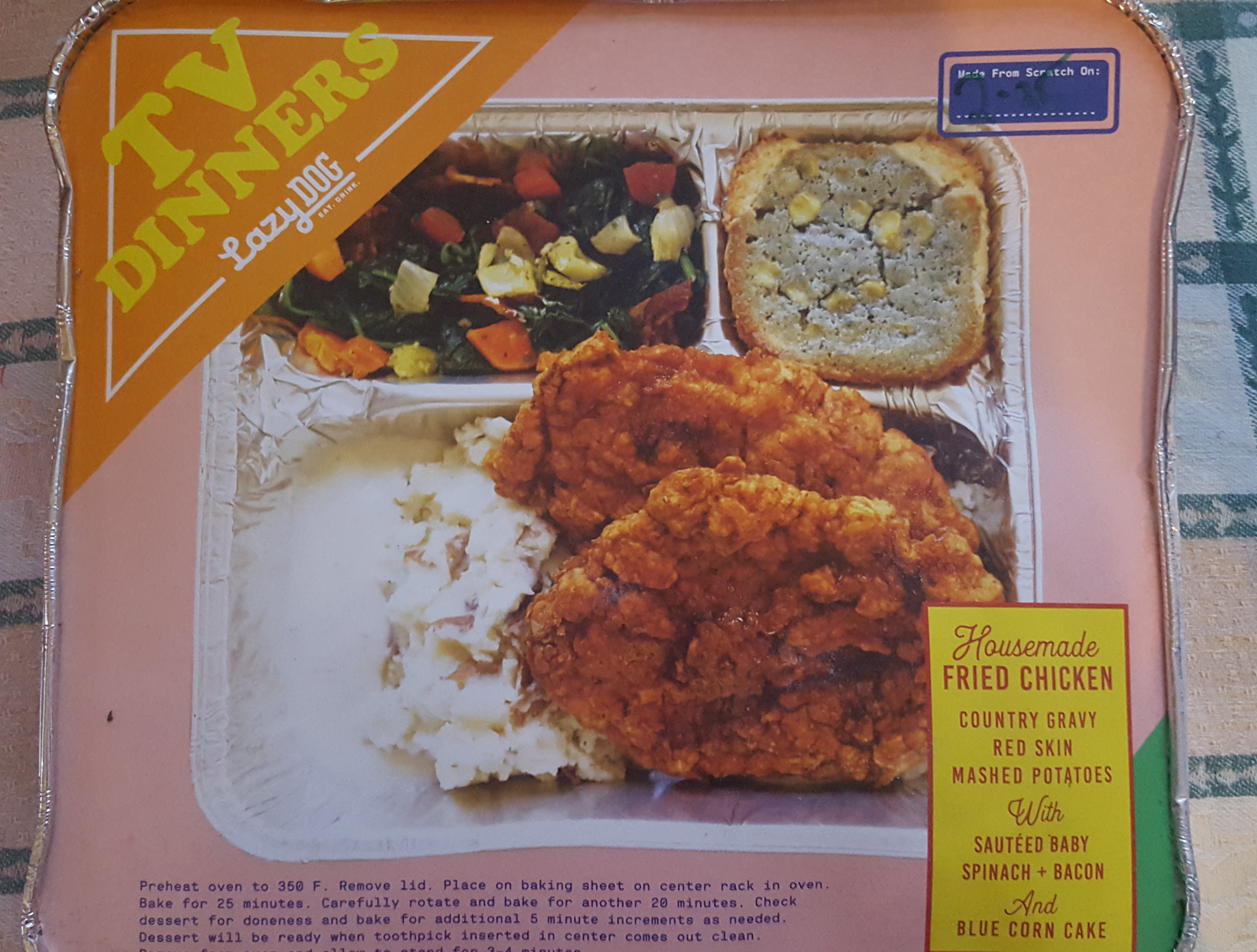 For $10 each, Lazy Dog sells frozen dinners to reheat at home. Unlike the flimsy packaging containing insubstantial TV dinners from my childhood, these are deep, heavy-duty aluminum trays full of food. The fried chicken meal featured two large, (as in enough for another meal) breaded/fried breasts, mashed potatoes and gravy, spinach with bacon bits and blue corn cake for dessert.