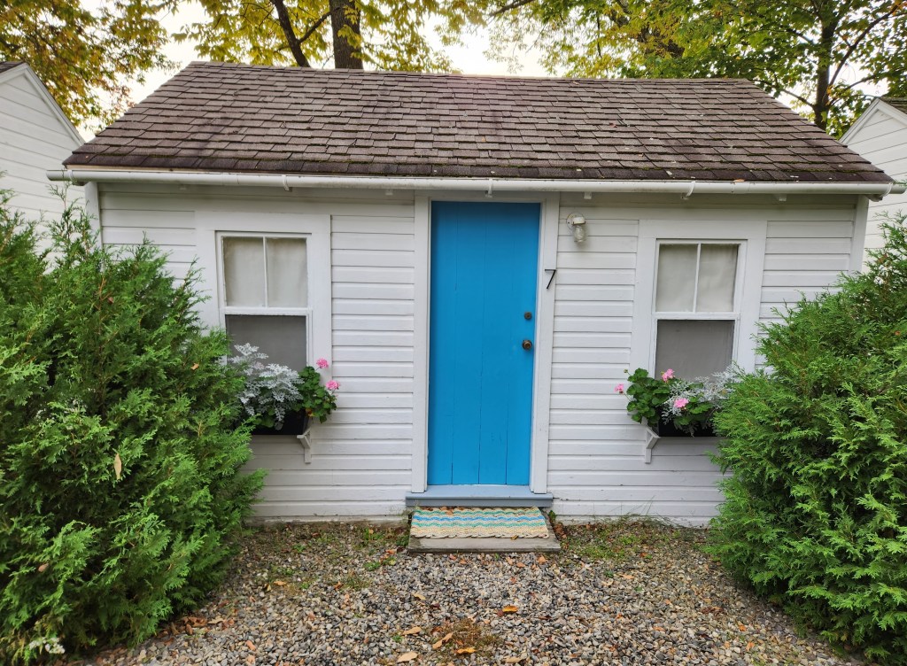 We were greeted by Alice, the owner, and Lucy, her affectionate Golden Retriever. Along with keys to our retro motel cabin, we received an envelope with house rules and suggestions for nearby attractions, and two sets of earplugs. Alice pointed out the pool, now closed for the season, and led us to the large sitting area lined with shelves of books, board games and record albums.