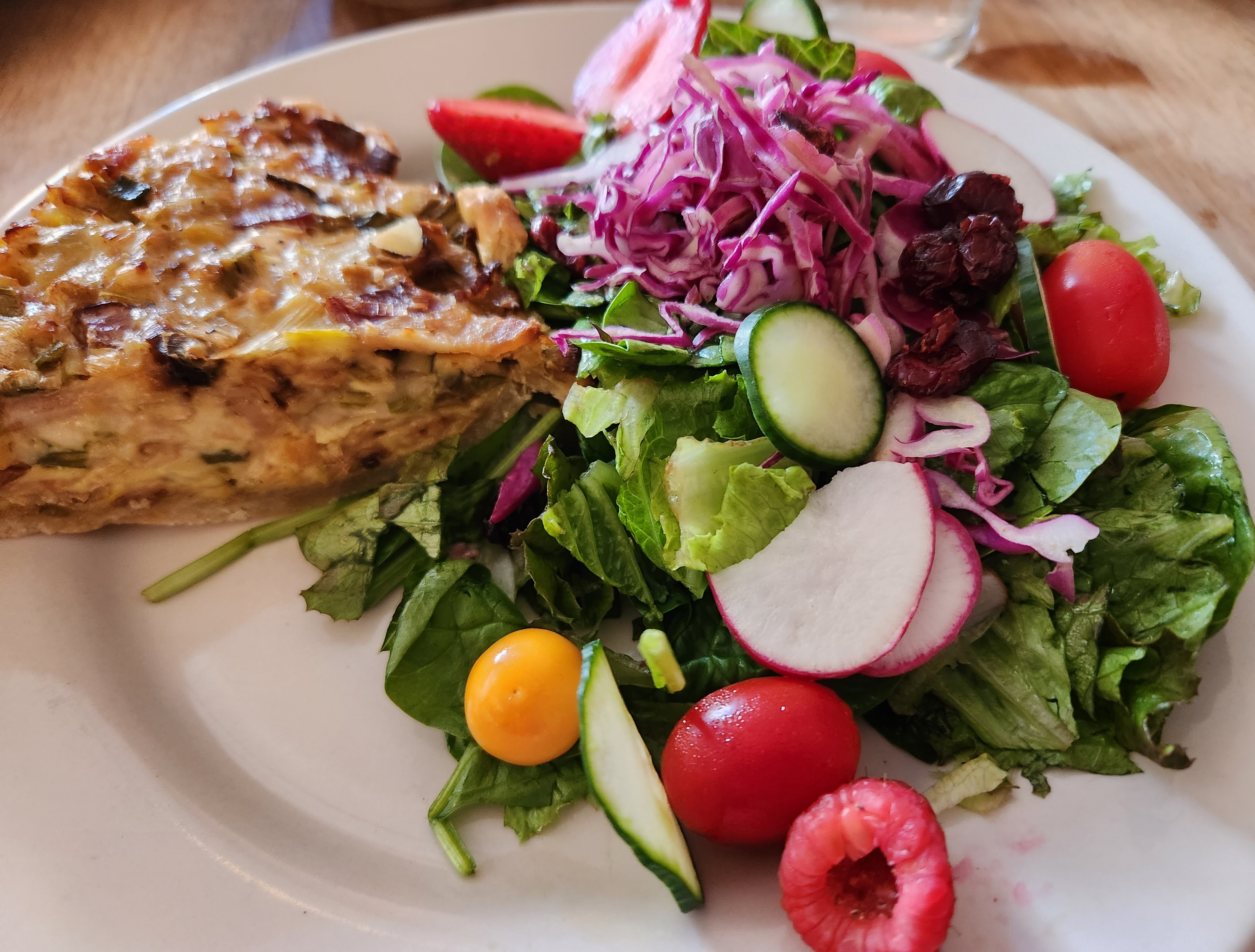 m.henry, a popular spot in Andersonville, features an array of baked goods, traditional egg entrees and quiche, among other items. The rustic peasant quiche was chock full of asparagus, leeks, bacon and gruyere cheese on a flakey crust. The side salad was practically a meal in itself.