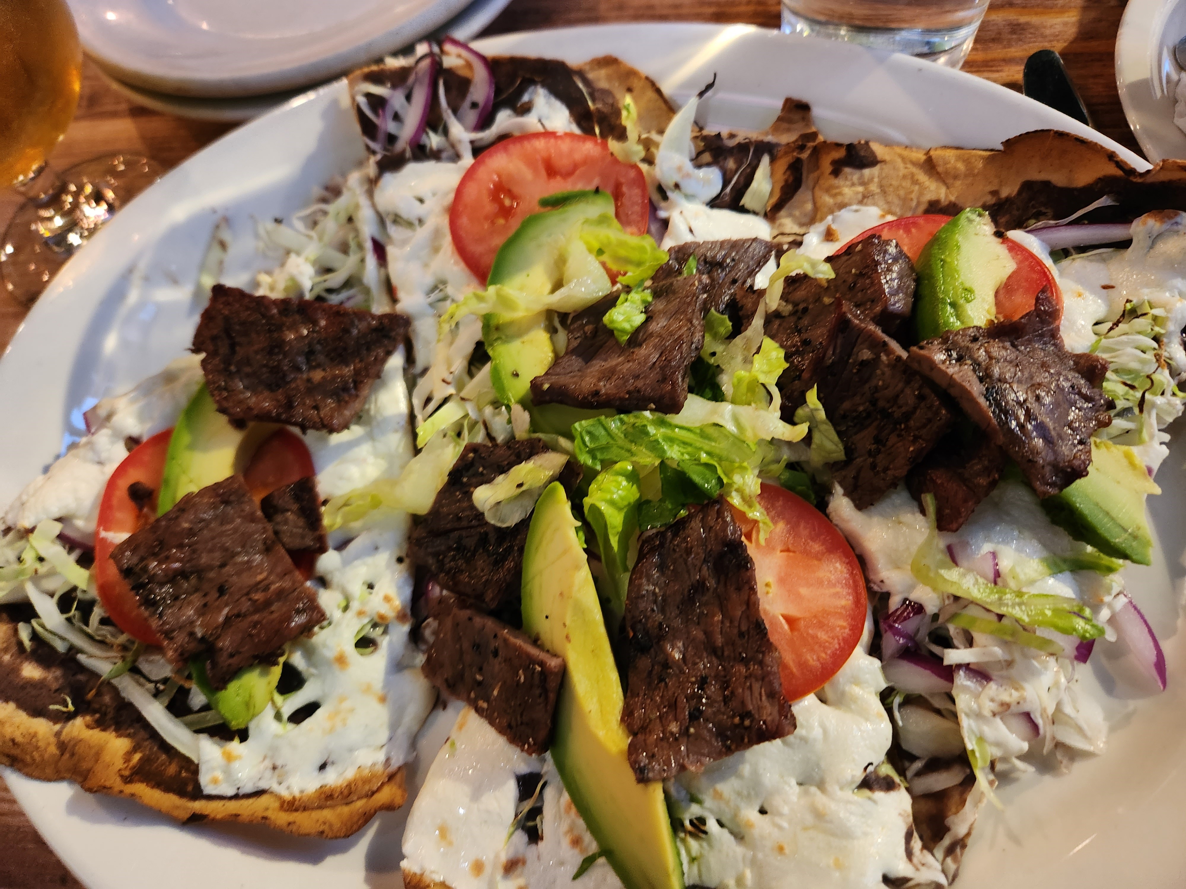 Another typical Oaxacan dish is the tlayuda, a large,crispy handmade corn tortilla is topped with a choice of meats, sliced tomatoes, avocados and cabbage. Think nachos on steroids.