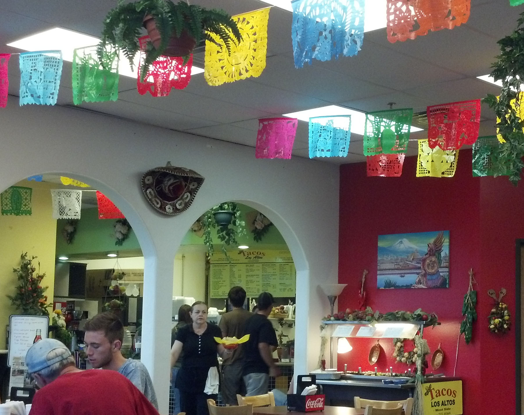 From the outside, Tacos Los Altos is nondescript. The interior, however, is bright, colorful and friendly. A serve-yourself salsa bar features almost too many choices. Pico de Gallo and the green salsa were rich and piquant – they were just right.