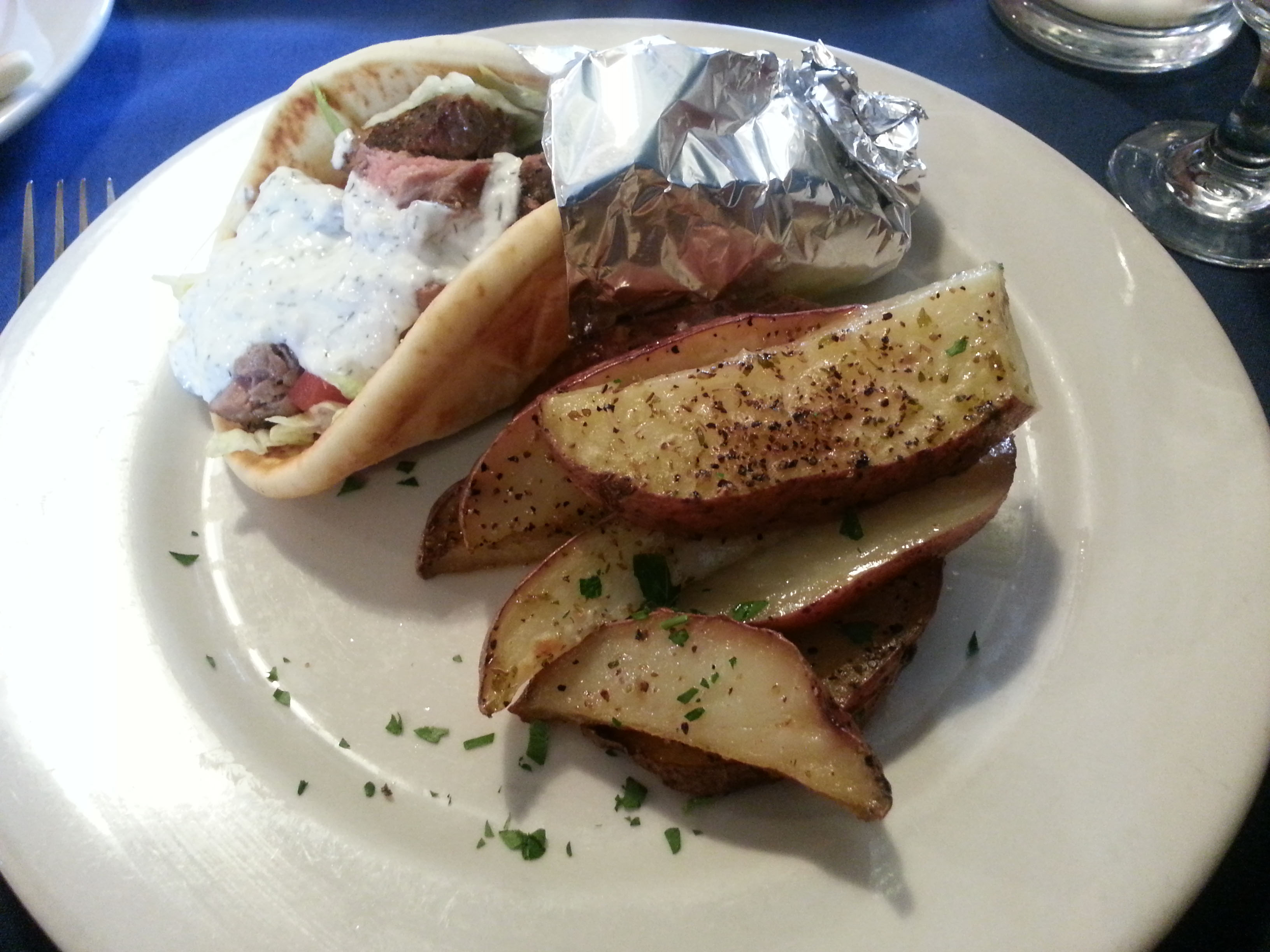 As awe-inspiring as the setting is, it was overshadowed by the meal. We started with hummus. This, like everything we were served, was beautifully plated. Creamy, house made hummus sprinkled with feta is surrounded by fresh, raw vegies and grilled pieces of pita. This, also like everything served, was a substantial appetizer easily shared among four.