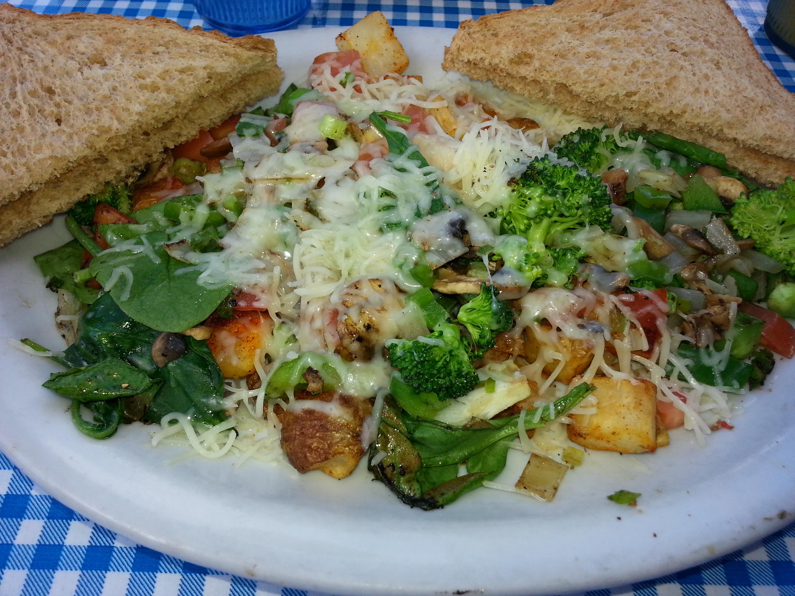 Recently, we braced ourselves for a long wait and made sure we had plenty of cash in our wallets. We got a table soon after arriving and didn’t have to spend everything we had. The appeal is fresh food, and lots of it, almost too much. The Spuds and Vegies is one of my favorites. Sautéed broccoli, onions, tomatoes, mushrooms, green peppers and spinach served over country potatoes. Eggs and cheese on top are optional. The meal is like eating a carb-building garden.