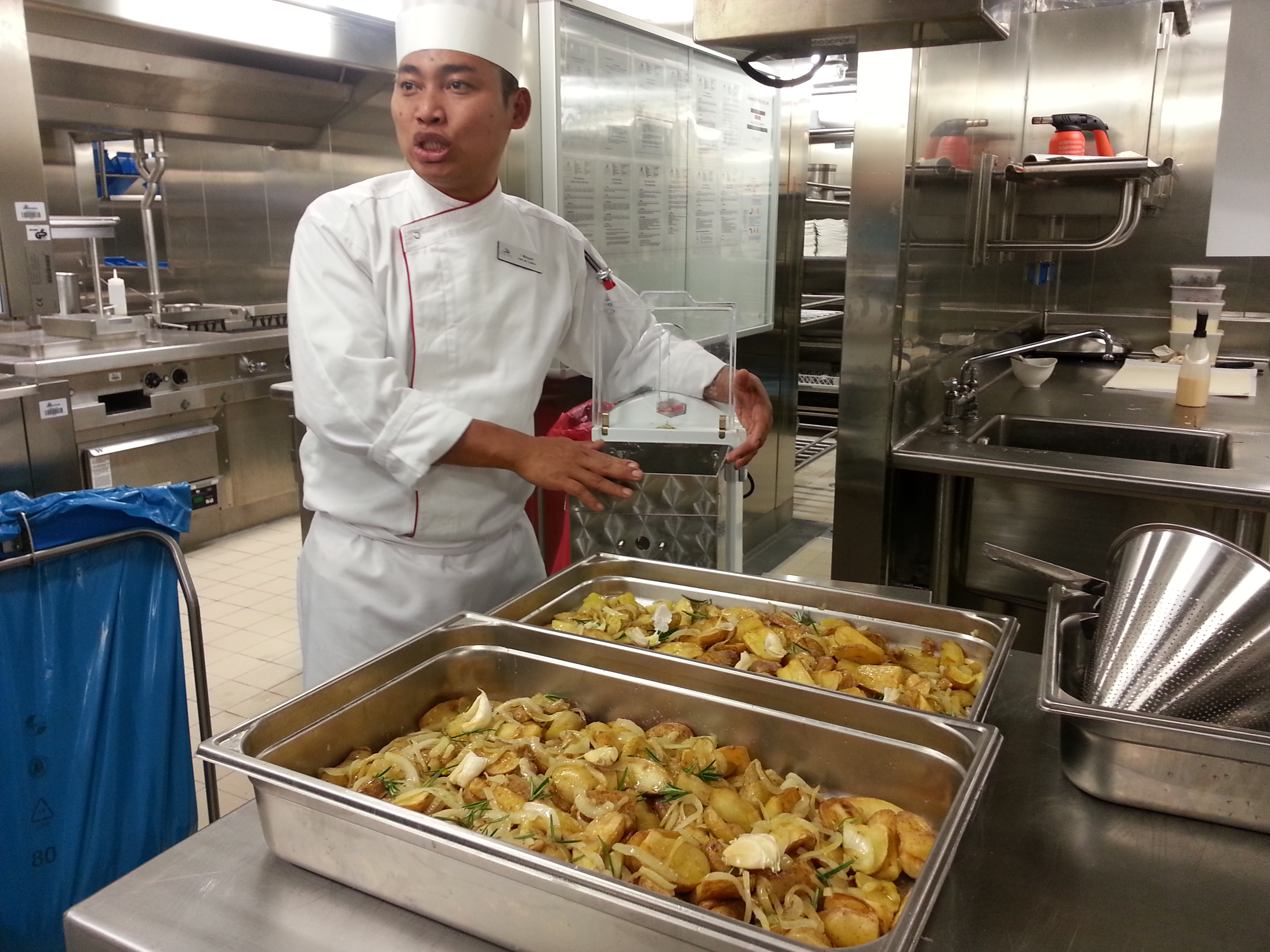 Everything is made fresh, from the breads and pastries to pasta. Chef de cuisine Wayan explained that formulas are used to determine how much of each food item is needed on a daily basis. This involves a heavy reliance on past experience and nationality of the guests, among other factors. For example, the kitchen goes through 3,200 eggs per day!