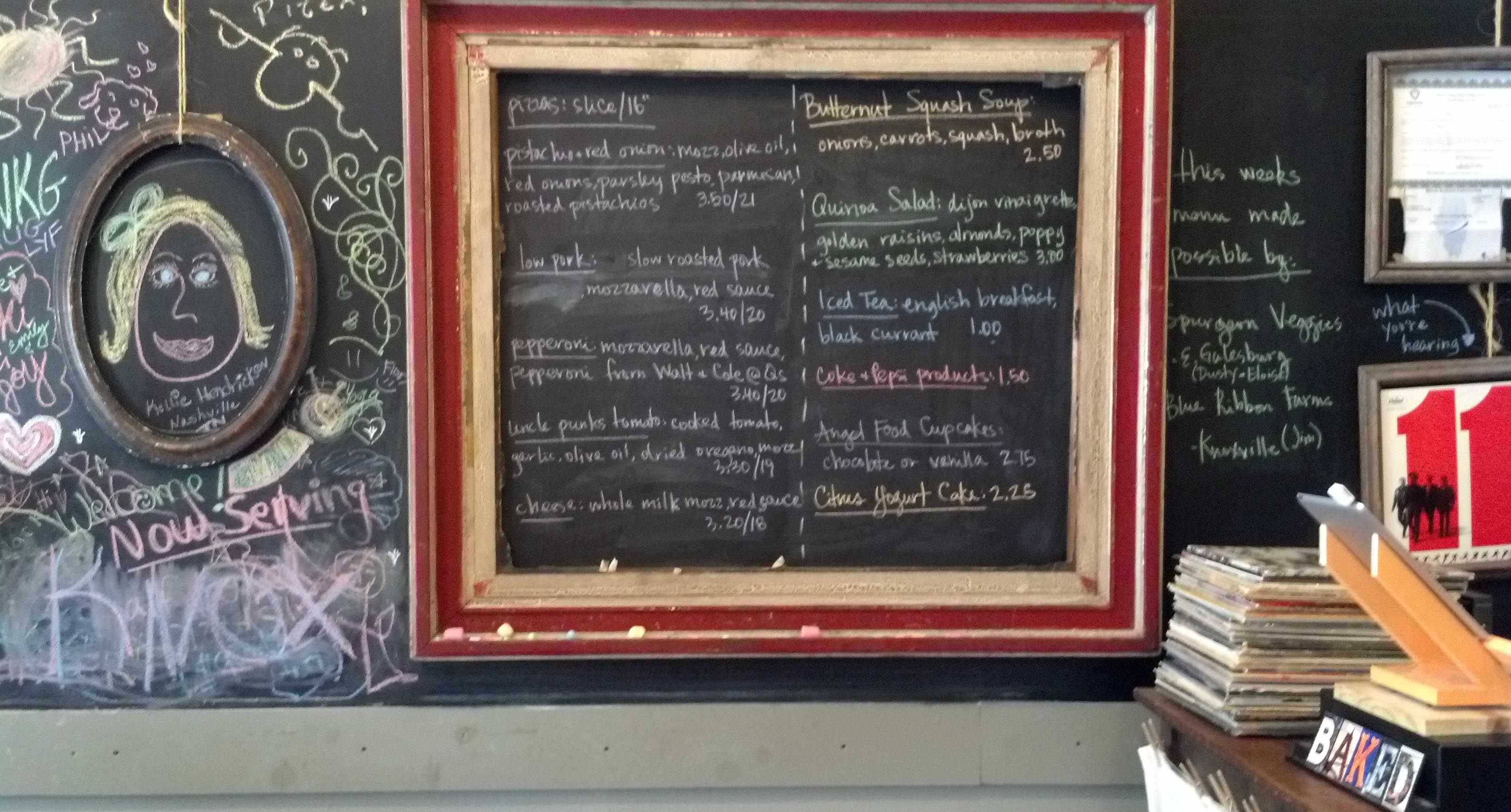 Among the first things you notice when entering Baked is the absence of tables. Then eyes turn to a turntable playing records, real 33 1/3 LPs. The distressed brick walls also command attention as does a large frame on part of a chalkboard listing the day’s offerings. It’s an eclectic scene which reflects the menu: five types of pizza, a soup, a salad, two types of Angel Food cupcakes (chocolate and vanilla) and (usually) another dessert. The other distinguishing feature is the friendliness of the staff.