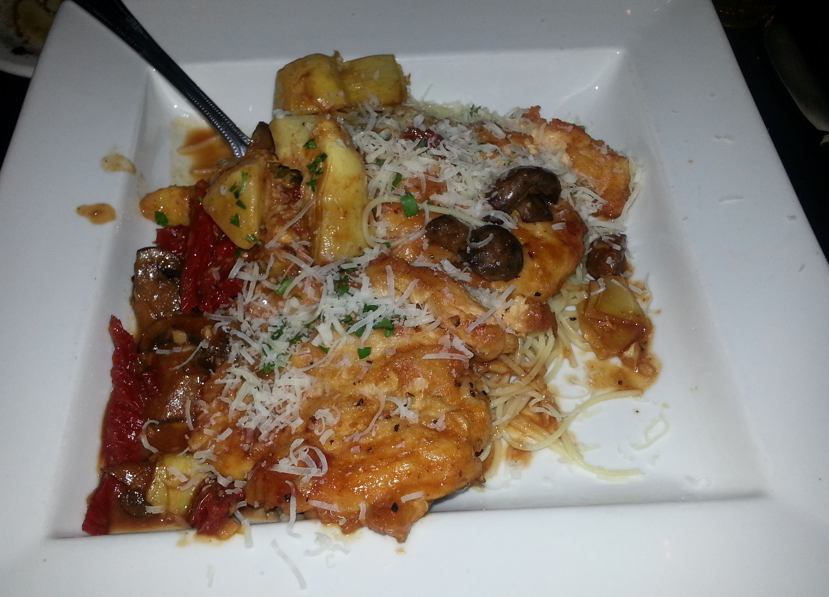 The Chicken Valeria falls into the “Originals” category. Two lightly-breaded chicken breasts are cooked with lots of garlic, sun-dried tomatoes and artichoke hearts in a subtle mushroom sauce. It was all served over a bed of angel hair pasta.