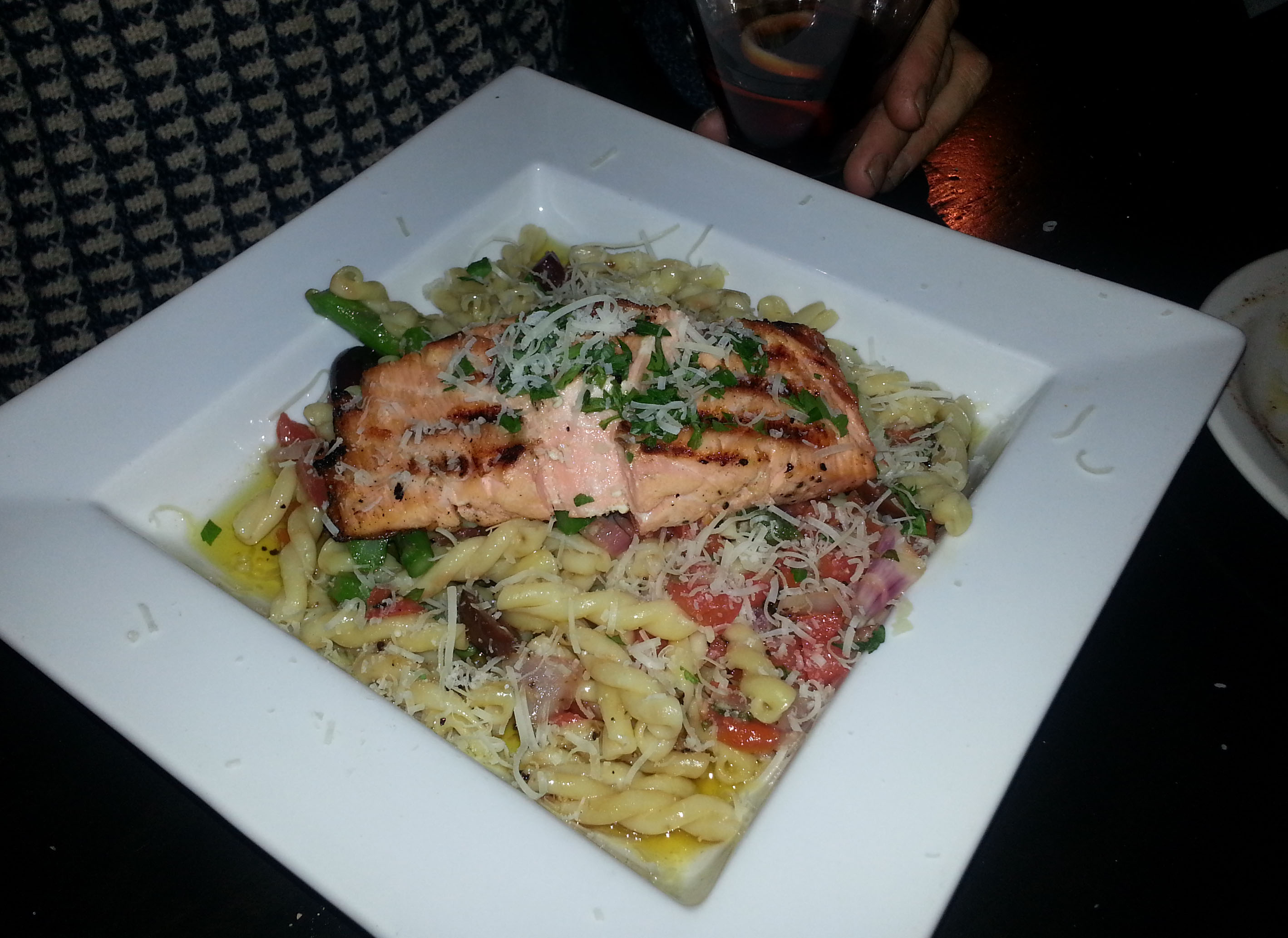 The Lasagna was traditional and apparently satisfying since my husband happily cleaned his plate. I didn’t sample my friend’s Grilled Salmon, but it looked delicious. We all shared an order of Green Beans cooked al dente shimmery with olive oil and speckled with copious amounts of diced garlic and chunks of pancetta.