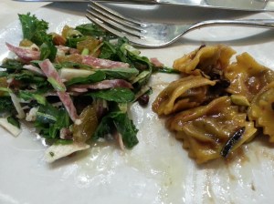 Finally, the chopped salad, a combination of Brussels sprouts, endive, mint, salami, and fried lentils — all thinly sliced, er chopped.