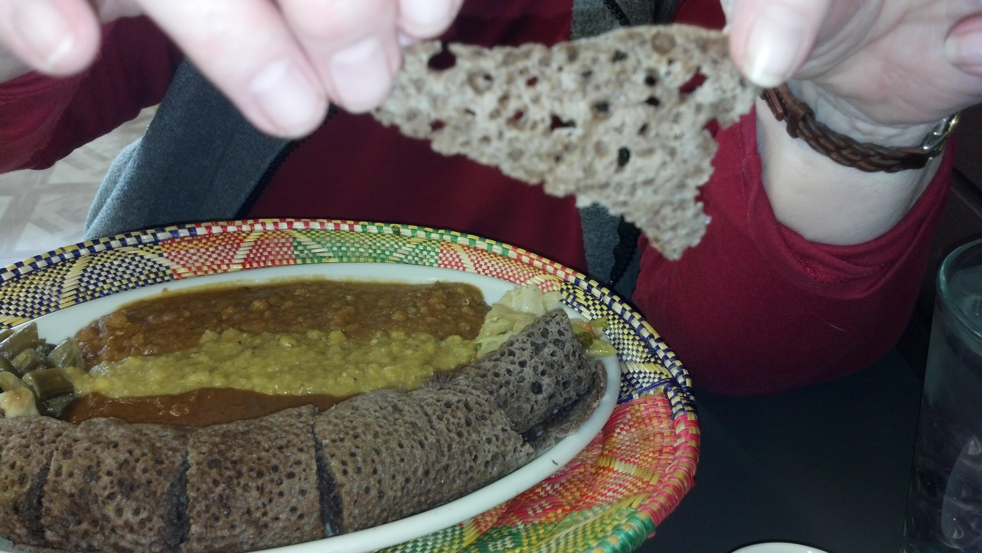 Having no real clue what to order, the combination plate seemed like a great way to sample several different tastes. It featured red lentils in a mild spice mix, and green lentils in a traditional berbere sauce, which is a blend of garlic, red pepper, cardamom, coriander and other spices. Also on the plate were green beans and carrots in a spicy tomato sauce along with cabbage in a briny garlic and onion sauce. Everything was served over injera, the traditional Ethiopian thin, sponge-like bread. Rolls of injera lined the plate.