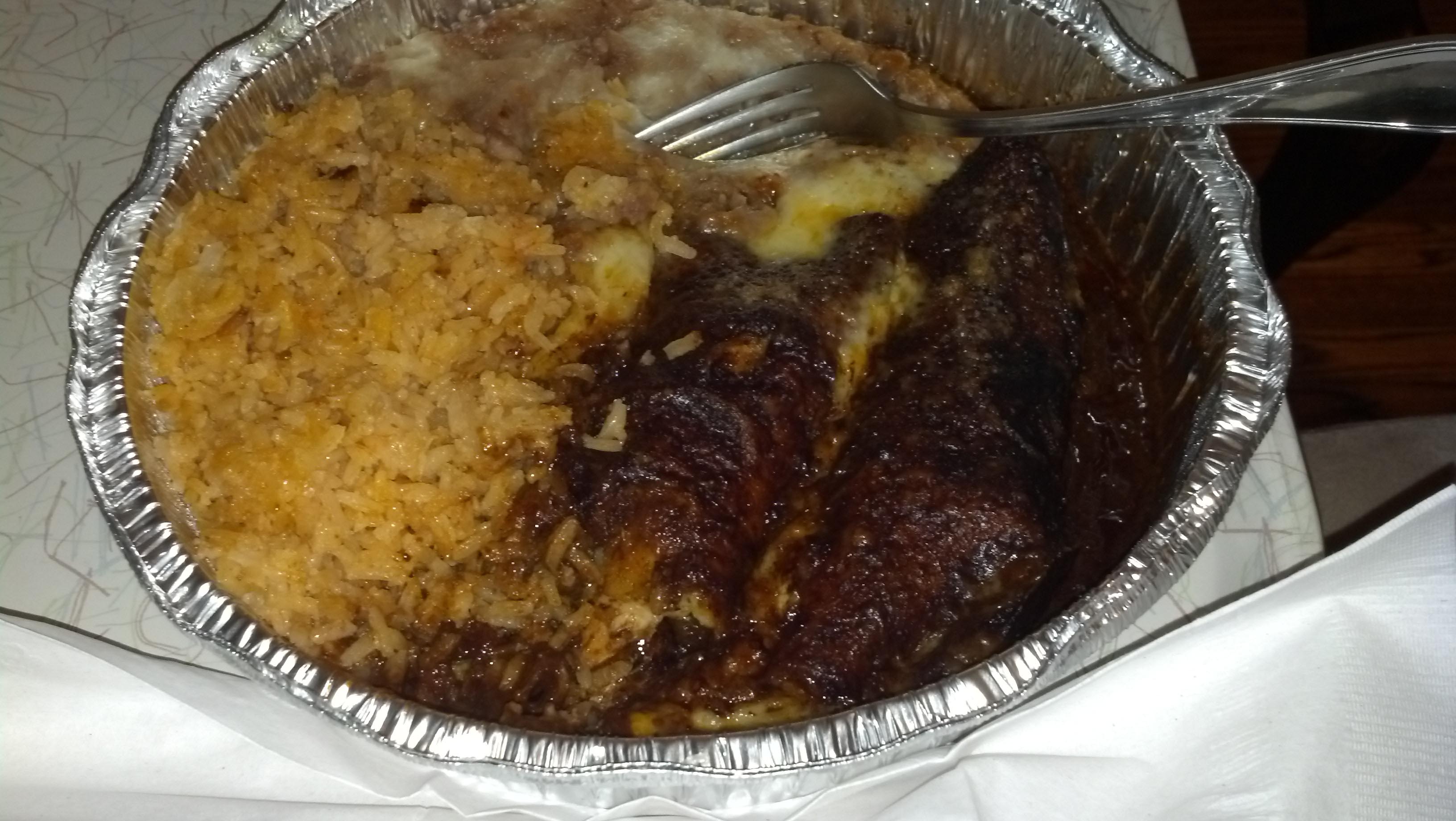 I ordered the Mole Enchiladas which came with a salad, rice and beans. The enchiladas were filled with chunks of chicken slathered in mole thick with an abundance of spices that blend perfectly with one another. The sweet taste of cinnamon was the perfect foil for the hint of bittersweet chocolate. Not only were my taste buds enamored with the entrée, but the rice and beans – especially the beans – were also loaded with flavor. These are no canned variety.