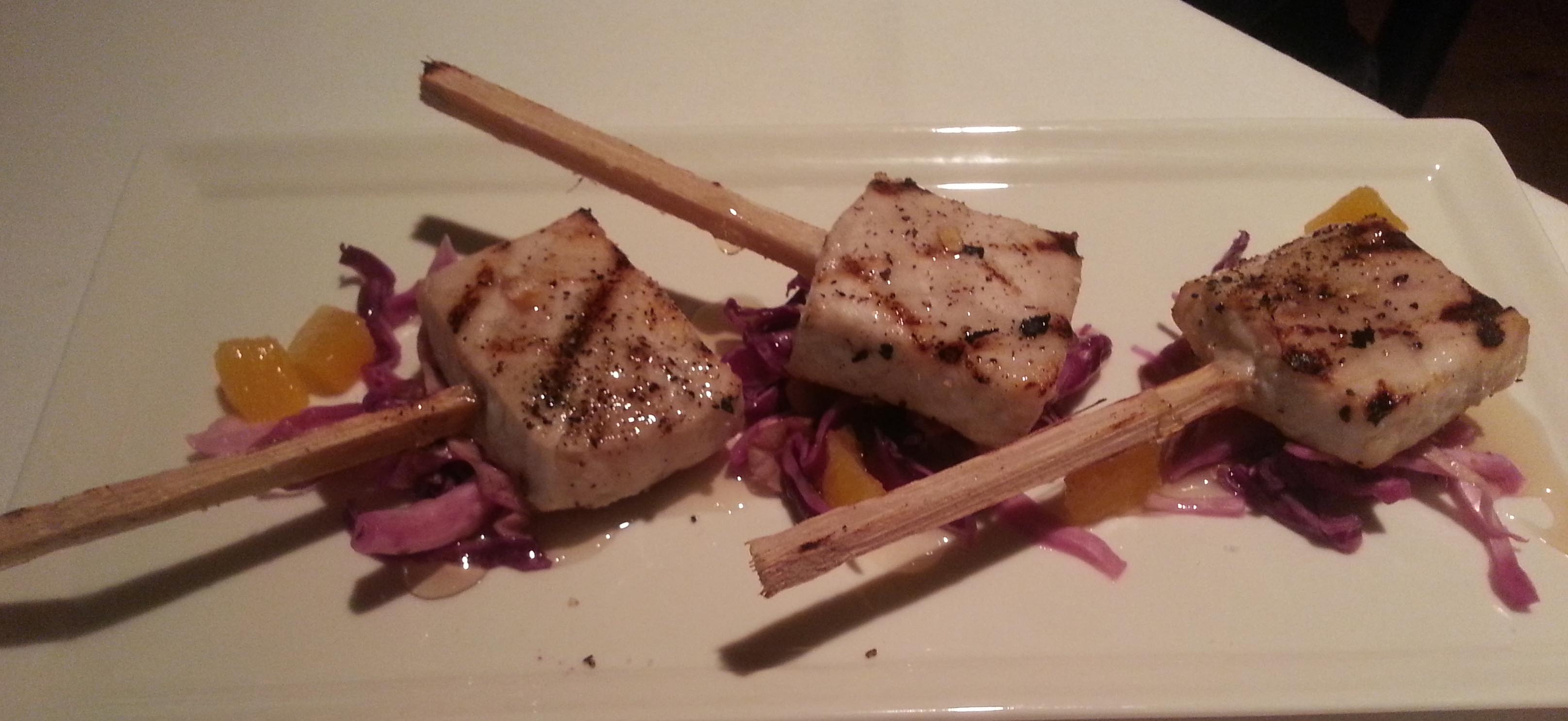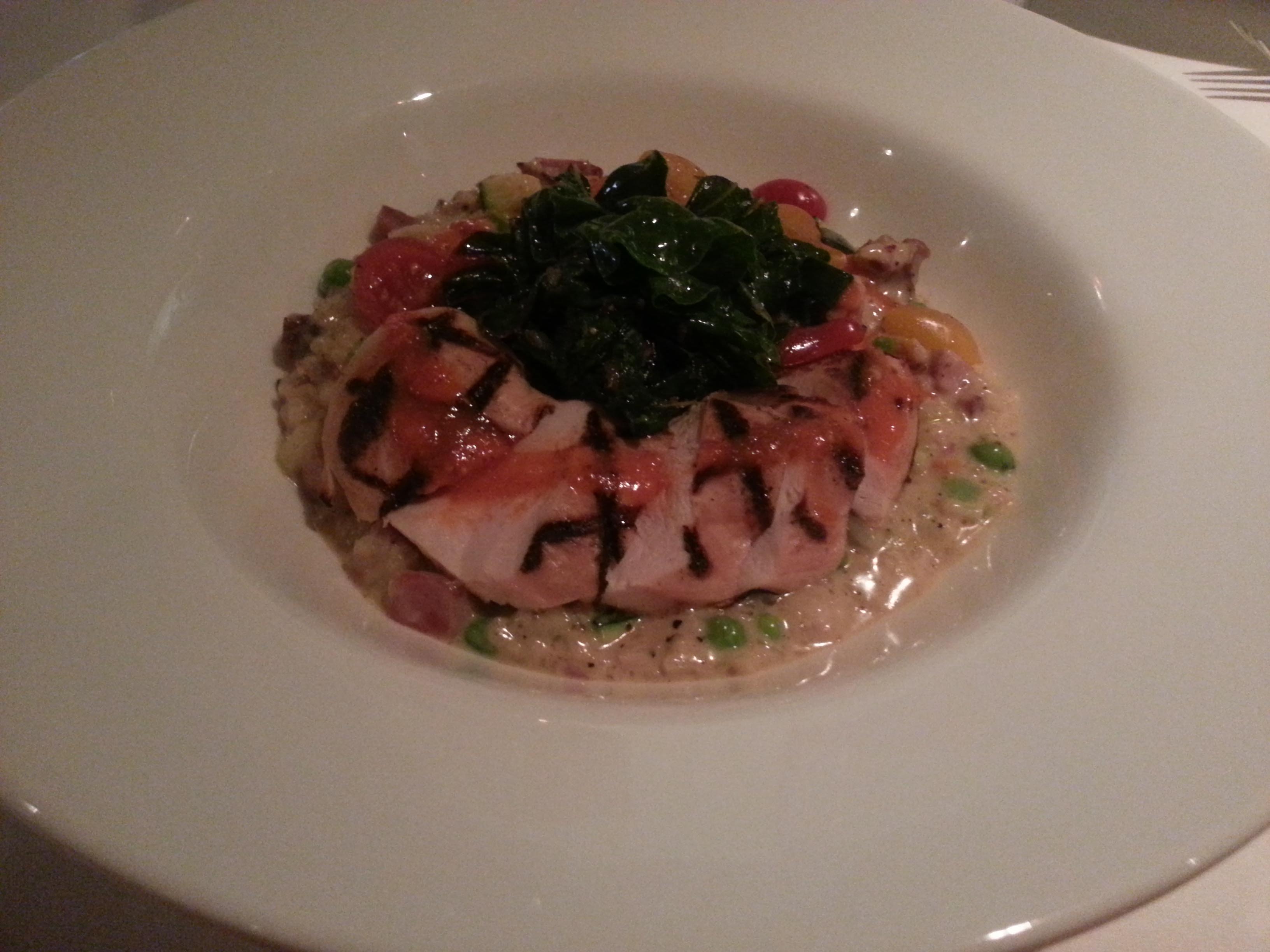 Apparently a lot of people like The Blue Star on Sunday nights – and with good reason. Not only is the menu inventive, but all bottles of wine are half price. The place was packed, I’m talking about the dining room not just the bar and lounge, which are routinely busy. We started with Swordfish Sugarcane Lollipops. A glistening sauce coated the grilled chunks of skewered fish which were tender with a hint of citrus and spice that found their way into the sauce. Grilled chicken topped with spinach and a roasted red pepper sauce on creamy risotto was delicately rich. Ham, mushrooms, and peas added balance. The flaky Pan Roasted Halibut was served with sweet pea pesto and pasta.